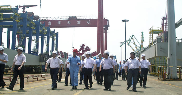在海西重機總裝現(xiàn)場,張德平副市長實地考察了待批量發(fā)往黎巴嫩的岸橋和輪胎吊項目、發(fā)往馬來西亞的帶斗門機項目、發(fā)韓國鮮光新港的軌道吊項目及承制、調(diào)試的功能性海工平臺項目等。并聽取了海西重機董事長孫國慶關(guān)于企業(yè)上半年經(jīng)濟運行情況、轉(zhuǎn)型升級取得的成績以及在目前經(jīng)濟形勢下的合同承接情況。