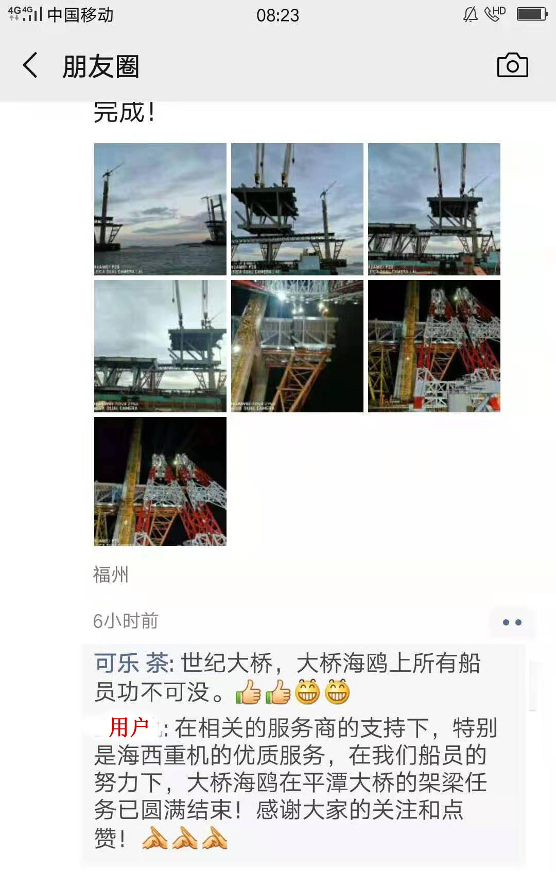 7月28日接到用戶通知,“大橋海鷗號”將于7月28日晚進(jìn)行第64、65片8鋼梁的架設(shè)(單重達(dá)3200噸),為保證工程順利實(shí)施,請海西重機(jī)安排技術(shù)人員進(jìn)行保駕護(hù)航,用船長的話就是“你們在現(xiàn)場,感到心里踏實(shí)”。公司當(dāng)即安排附近正在羅源灣碼頭做電控系統(tǒng)改造的宋靖浩工程師,前往現(xiàn)場。7月2900日傍晚5點(diǎn),吊裝正式開始,各崗位人員各負(fù)其責(zé),密切配合。直到凌晨時(shí)分,2片鋼梁順利架設(shè)完成,設(shè)備運(yùn)行一切正常,用戶對海西重機(jī)設(shè)備的穩(wěn)定性和服務(wù)的及時(shí)性給予了高度評價(jià)。至8月6日,平潭海峽公鐵大橋,最后一片鋼梁順利架設(shè)完成, “大橋海鷗號”不辱使命,圓滿完成任務(wù)。用戶喜悅的表揚(yáng),就是對我們優(yōu)質(zhì)服務(wù)的認(rèn)可和正反饋。