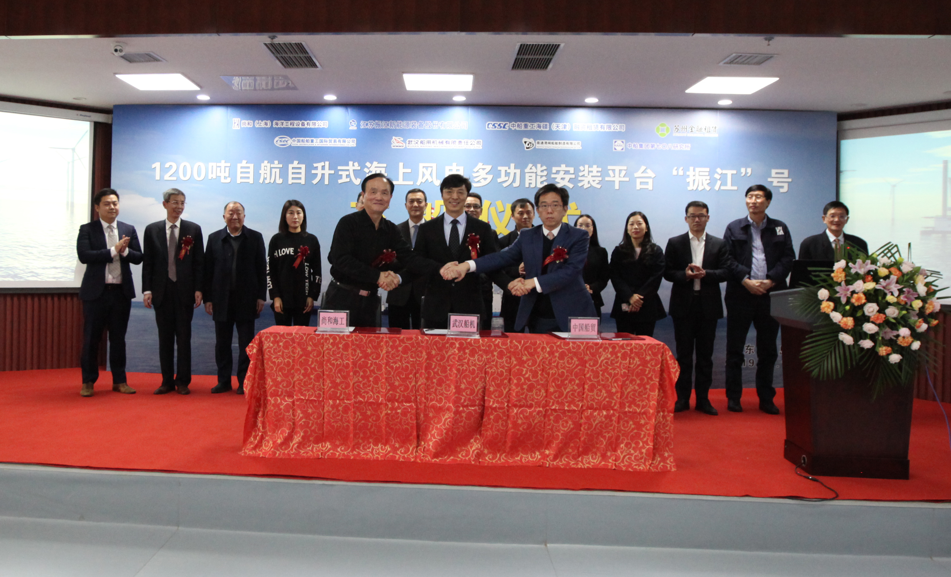12月13日下午,國內首座1200噸自航自升式風電安裝平臺——“振江”號交付儀式在武漢船機海西重機隆重舉行。尚和(上海)海洋工程裝備有限公司、江蘇振江新能源裝備股份有限公司、中信銀行、中國船舶及海洋工程設計研究院、中國船級社等單位領導和項目相關人員共同見證了這一歷史性時刻。