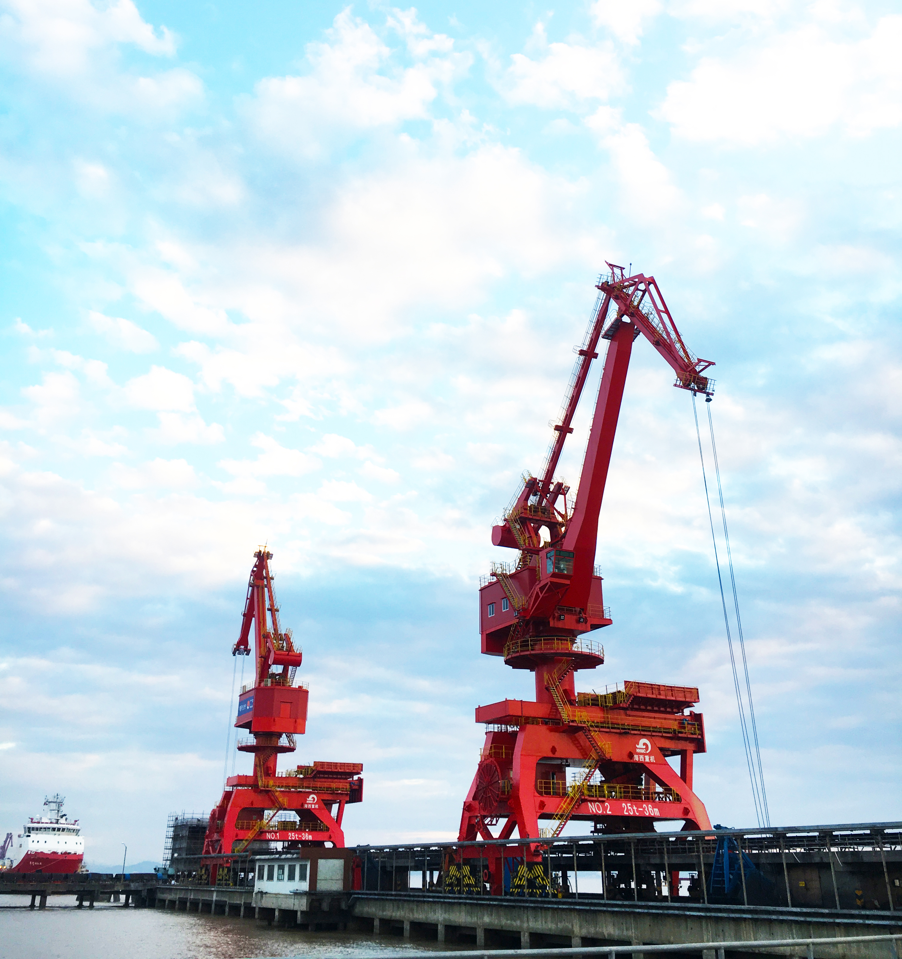 2臺(tái)門機(jī)為25T-36M四連桿帶斗門座式起重機(jī),額定起重量可達(dá)25噸,工作幅度36米,額定工作效率800/時(shí),是海西重機(jī)成熟的門機(jī)產(chǎn)品,也是目前各大港口廣泛使用的典型門機(jī)之一,設(shè)備主要用于煤炭和海沙的卸船。