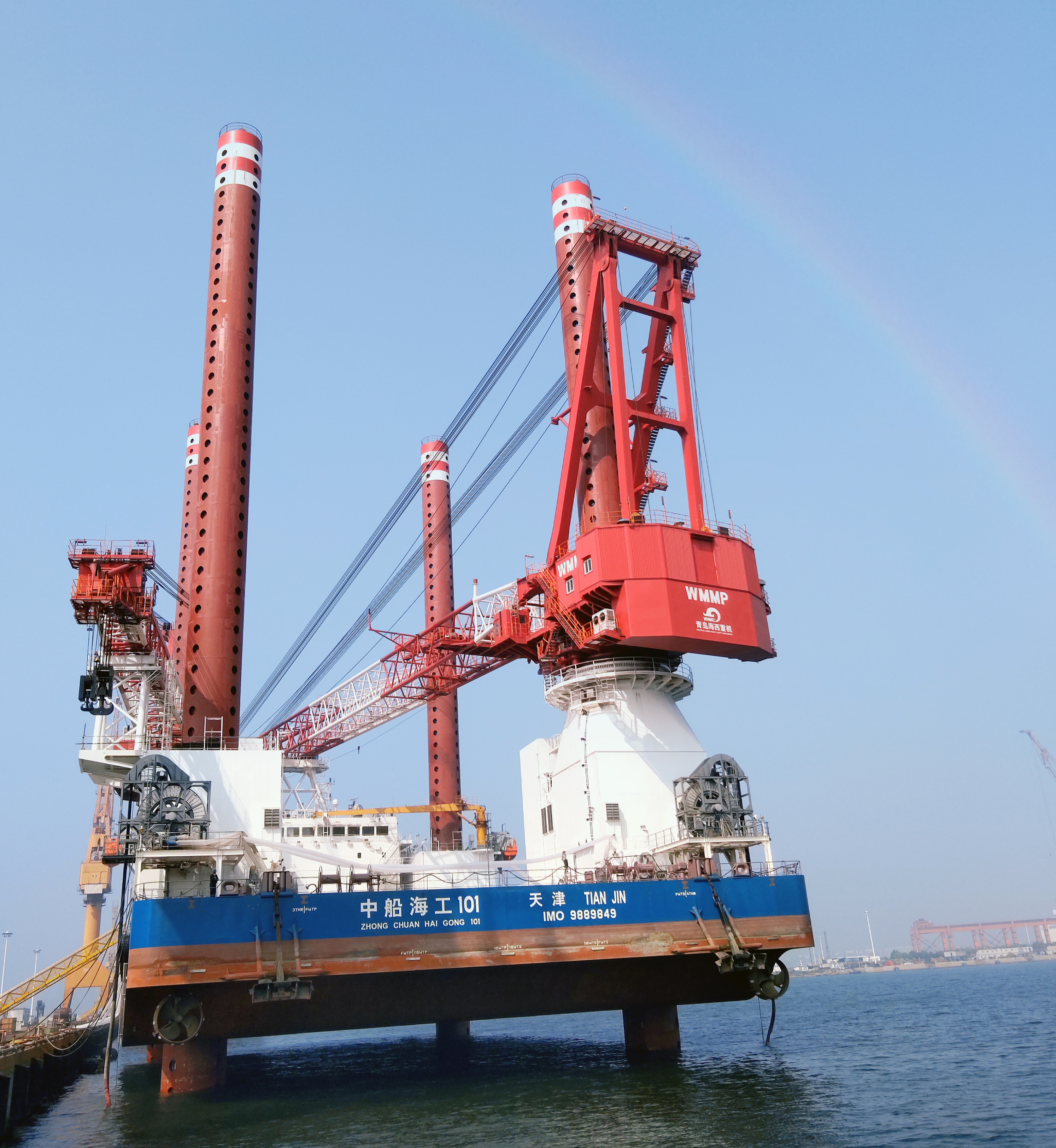 7月31日,大船集團(tuán)山船重工為中船集團(tuán)(天津)海上風(fēng)電公司建造的自升式海上風(fēng)電安裝平臺“中船海工101”順利交付。該平臺的關(guān)鍵設(shè)備350T1000T繞樁吊(以下簡稱H15項(xiàng)目)由海西重機(jī)負(fù)責(zé)制造、安裝、調(diào)試。