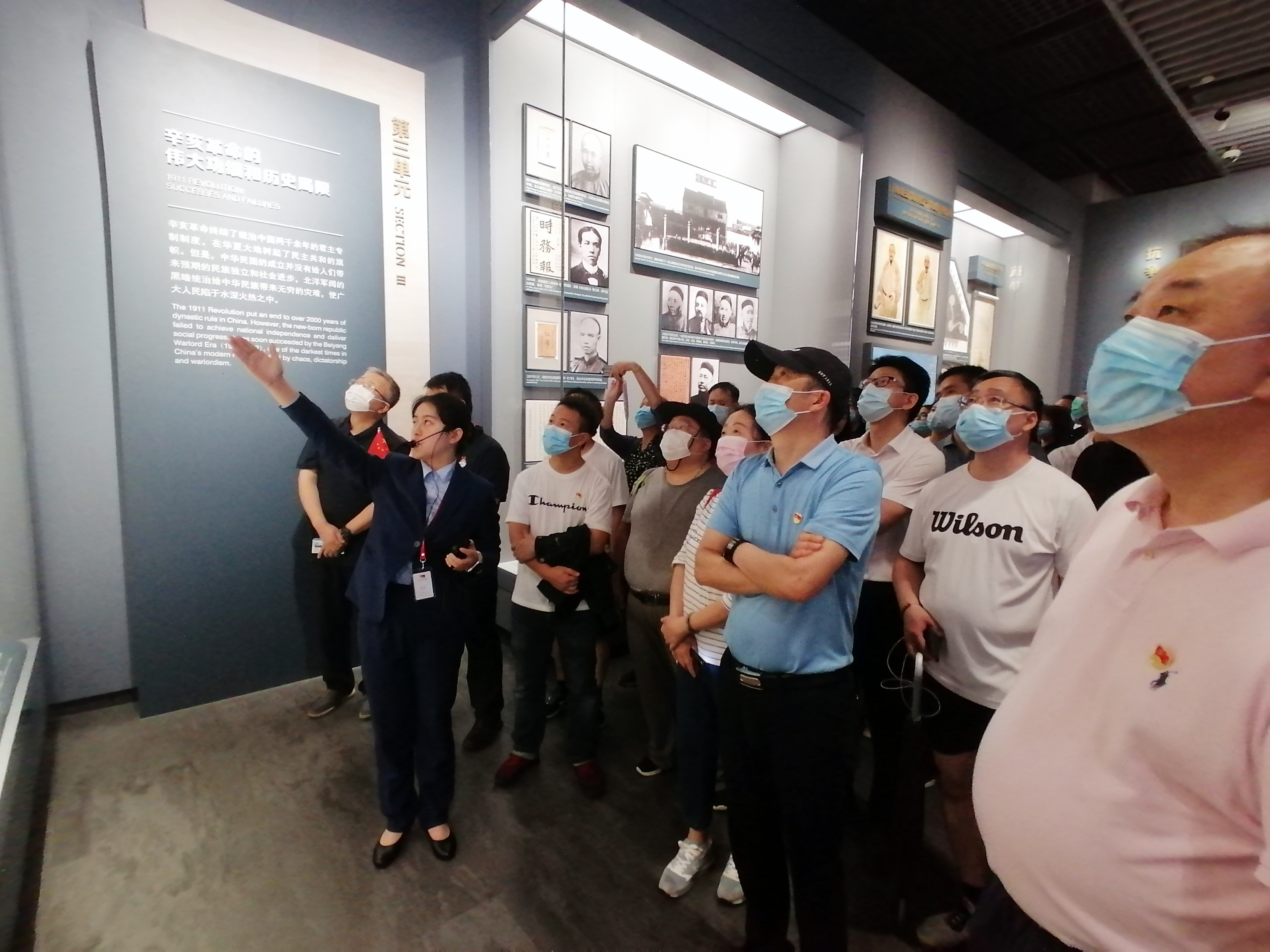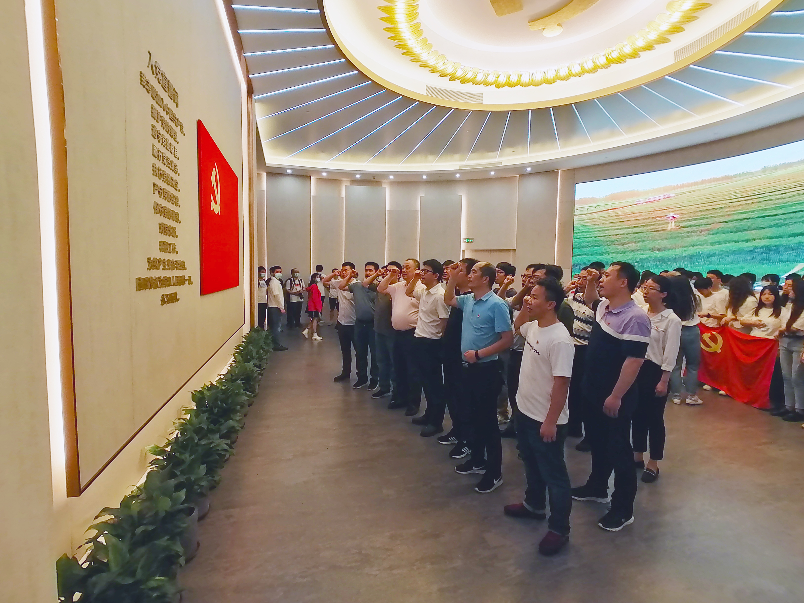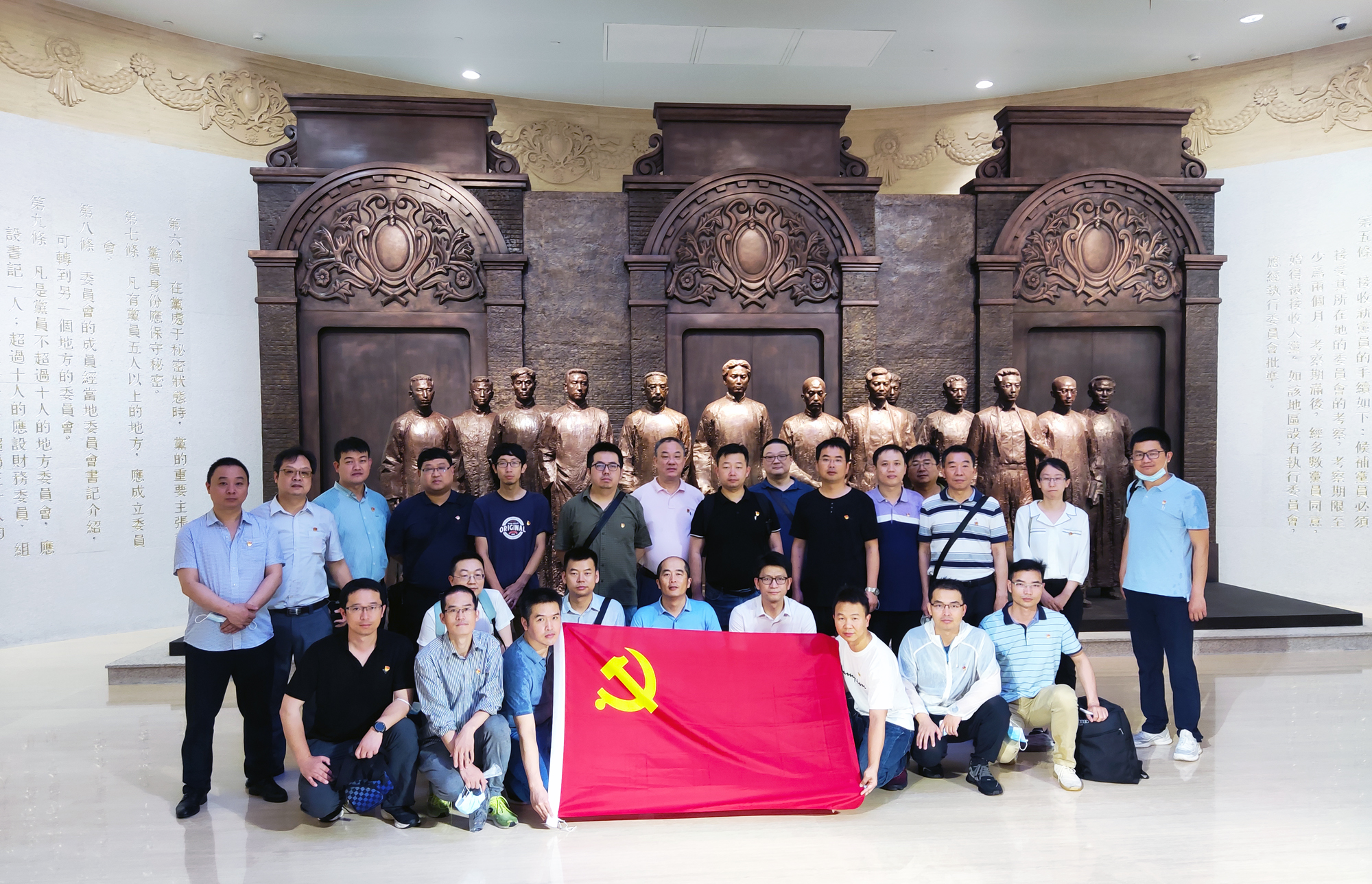 走進(jìn)紀(jì)念館,映入眼簾的是一個巨幅瓷板畫《日出東方——從石庫門到天安門》,畫面中容納了一大會址、紅船、井岡山、北京天安門等革命圣地元素,反映了中國共產(chǎn)黨由小到大、由弱到強(qiáng)的奮斗歷程。進(jìn)入序廳,迎接參觀者的是主題雕塑《偉大的開端》,13位一大代表站在石庫門前,向我們展示著他們的堅(jiān)定信念和激昂的革命情懷。跟隨講解員,沿著展區(qū)布景的脈絡(luò)一路參觀了“前仆后繼、救亡圖存”,“民眾覺醒、主義抉擇”,“早期組織、星火初燃”,“開天辟地、日出東方”,“砥礪前行、光輝歷程”五個部分,展廳集中呈現(xiàn)了建黨時期的珍貴文獻(xiàn)、照片、實(shí)物,并以數(shù)字化、智能化的方式,立體重現(xiàn)了中國共產(chǎn)黨建黨初期在上海的革命實(shí)踐。大家在銘刻歷史印記的文物實(shí)物,內(nèi)容詳實(shí)的刊物、圖片、圖表前駐足,在視頻影像和場景還原處停留,仔細(xì)聆聽講解,用心感悟、感知中國共產(chǎn)黨在上海創(chuàng)建的光榮歷史、奮斗歷程。最后,在宣誓大廳,面對鮮紅的黨旗,朱聲凱帶領(lǐng)大家宣誓,一起重溫入黨誓詞。