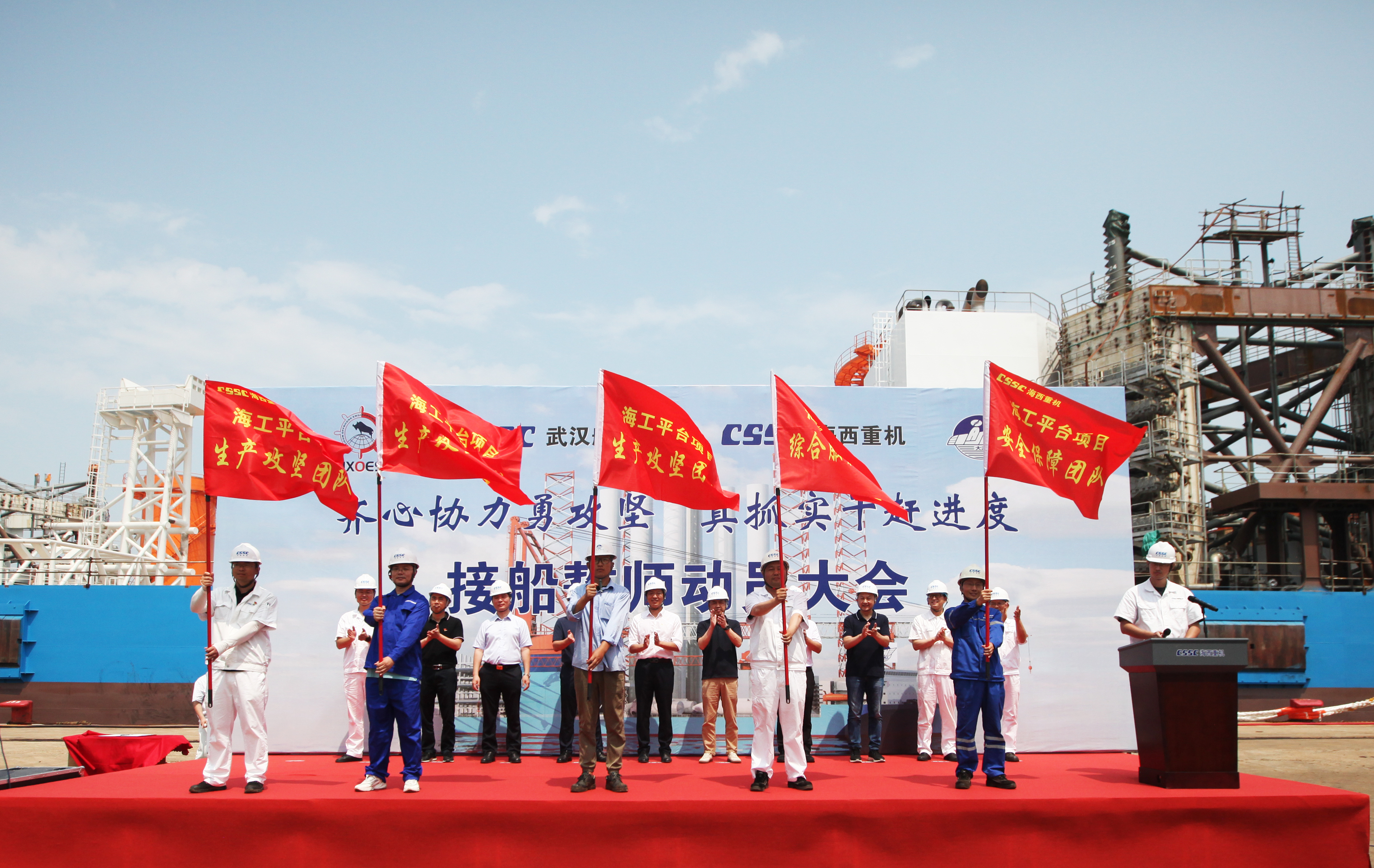 為了明確目標(biāo)、凝聚共識(shí)、齊心協(xié)力、克難攻堅(jiān),亮明迎難而上的堅(jiān)定信心和堅(jiān)強(qiáng)決心,動(dòng)員全員上下持續(xù)營(yíng)造濃厚干事氛圍,掀起“齊心協(xié)力勇攻堅(jiān),真抓實(shí)干趕進(jìn)度”的高潮,全力以赴打好海工項(xiàng)目集中攻堅(jiān)戰(zhàn),627日上午,武漢船機(jī)公司在海西重機(jī)碼頭生產(chǎn)現(xiàn)場(chǎng)組織開(kāi)展華西海工1600T風(fēng)電安裝平臺(tái)接船誓師動(dòng)員大會(huì)。江蘇華西村海洋工程服務(wù)有限公司董事長(zhǎng)高明、總經(jīng)理吳文勝,武漢船機(jī)黨委書記、董事長(zhǎng)馬聚勇,副總經(jīng)理孫凱,海西重機(jī)黨委書記、董事長(zhǎng)李儒新等出席動(dòng)員大會(huì)。江蘇大津重工有限公司總經(jīng)理王友軍、大連船舶重工集團(tuán)裝備制造有限公司項(xiàng)目經(jīng)理韓濤等相關(guān)領(lǐng)導(dǎo)參加了本次動(dòng)員大會(huì)。