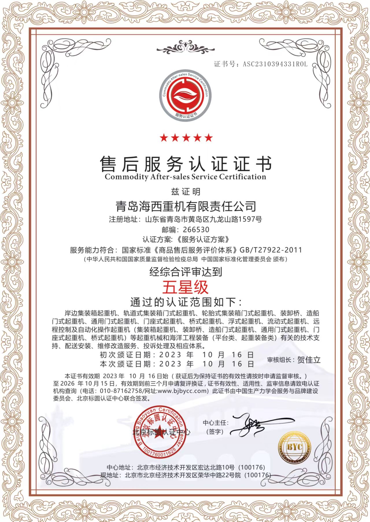 海西重機(jī)售后服務(wù)通過(guò)五星級(jí)認(rèn)證