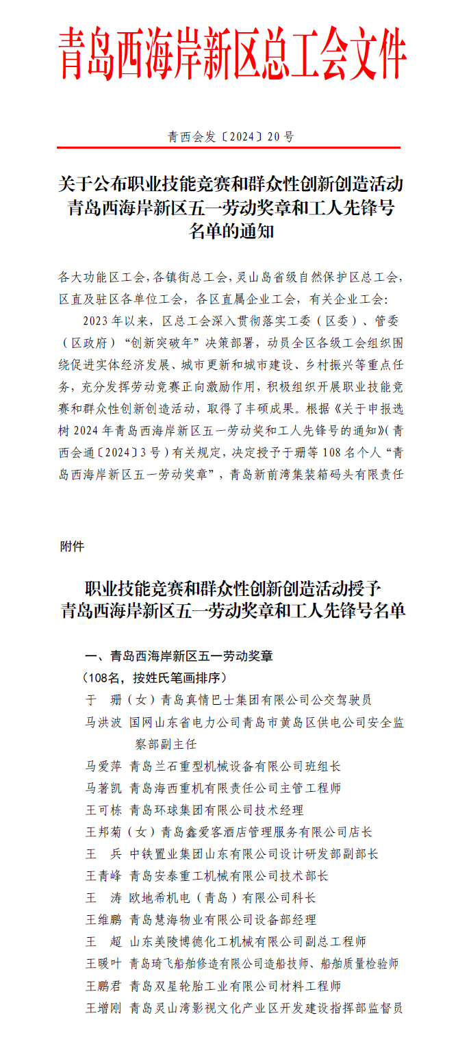 近日,青島西海岸新區(qū)總工會傳來喜訊,作為西海岸新區(qū)“職工創(chuàng)新成果”二等獎成果——“40T系列自動化軌道吊及其系統(tǒng)”的第一完成人,馬著凱同志被授予西海岸新區(qū)“五一勞動獎章”榮譽稱號。