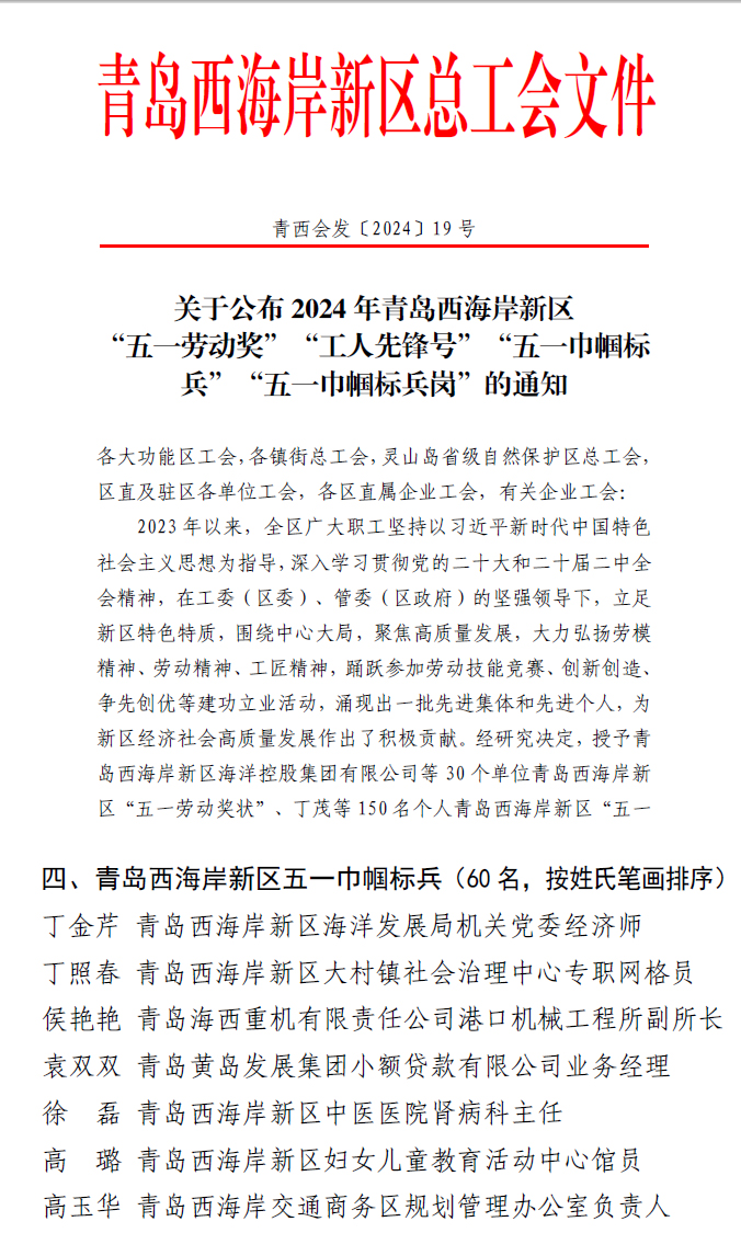 近日,青島西海岸新區(qū)總工會傳來喜訊,海西重機侯艷艷同志榮獲西海岸新區(qū)“五一巾幗標兵”榮譽稱號。