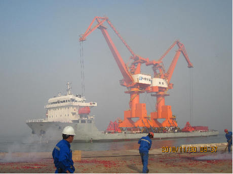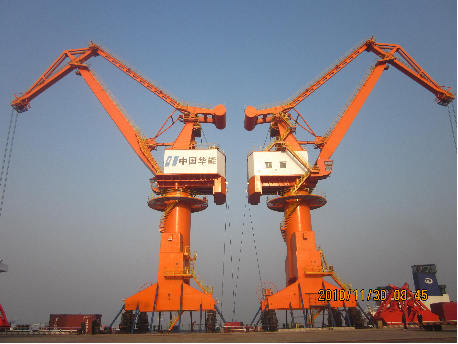 我司為中國華能董家口港制造的2臺MQ4040門座起重機順利滾裝上船
