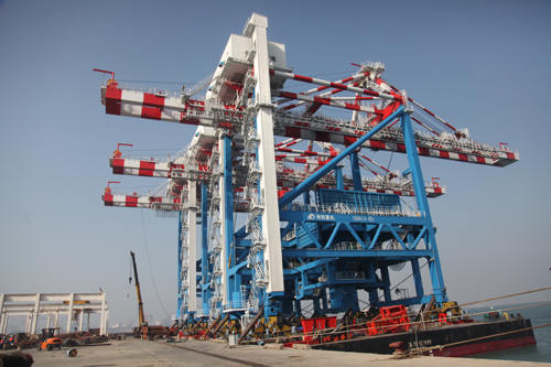 這次滾裝的三臺設(shè)備中,1500T/H卸船機是為華能(福建)海港公司研制的大型卸船機(共三臺);兩臺MQ2535門機是為中國重要深水港口之一,西南部第一大港——廣西防城港生產(chǎn)的首批(共七臺)門座起重機。這次三臺大型港機在同一天內(nèi)整機順利滾裝成功,再次驗證了公司設(shè)計水平、制造工藝、組織能力和海綁捆扎工藝的成熟性,也標志著武漢船機投資的青島海西重機經(jīng)過了近7年的從規(guī)劃、建設(shè)到邊建設(shè)、邊生產(chǎn)步入到成熟的批量化生產(chǎn)港口設(shè)備階段。為青島海西重機的最終目標:成為“中國最具競爭力的港口裝備、設(shè)備企業(yè)”邁出了堅實的一大步。