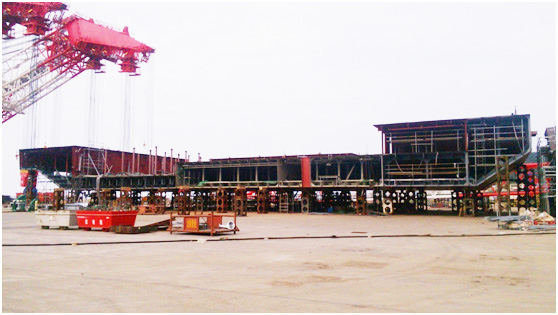 90米平臺船頭船尾的順利貫通是整船建造過程中的一個重要節(jié)點,標(biāo)志著整船工作重心從結(jié)構(gòu)件分段制作順利過渡到船臺整體搭載,為該平臺如期順利下水奠定了基礎(chǔ)。
